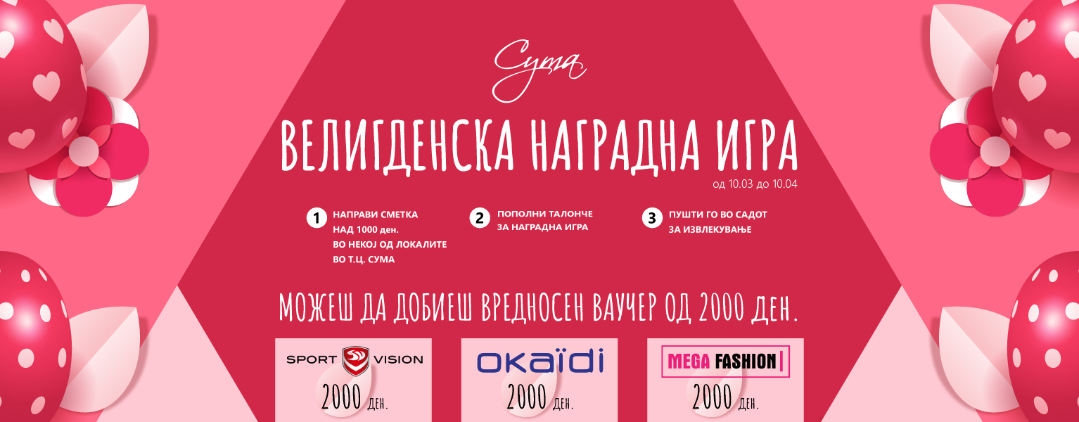 Драги наши, ја започнуваме Велигденската наградна игра: ВЕЛИГДЕНСКА ТРПЕЗА!Направете сметка над 1000 ден. во било кој локал во Т.Ц. СУМА, пополнете талонче за наградна игра…