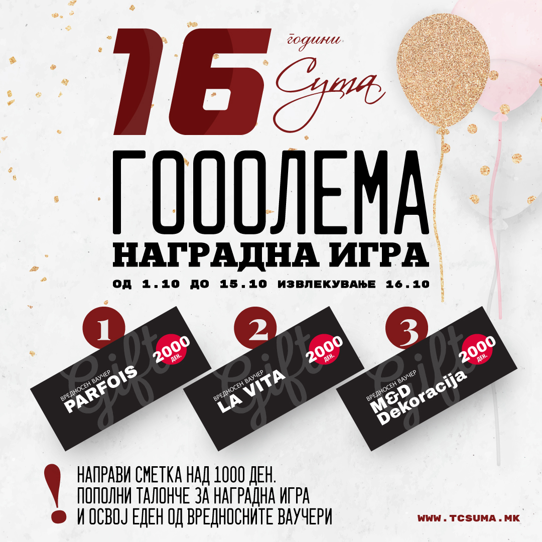 👉 Сè што треба да направите е да направите сметка над 1000 денари во било кој од локалите во ТЦ СУМА, да побарате купон и да го пополните за учество.